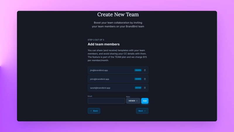 All the team members have access to the Templates, Watermarks, and Brand Kits within the team, and their accounts have access to all the BrandBird Pro features.