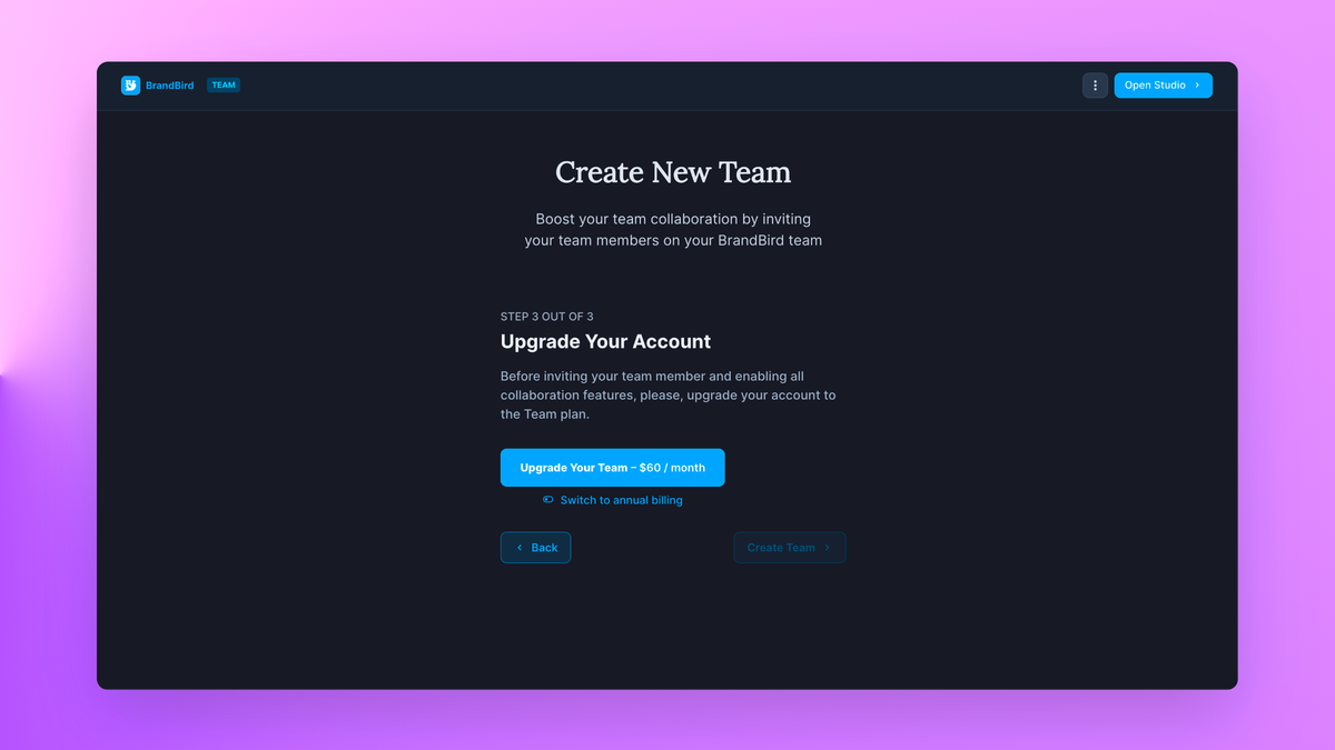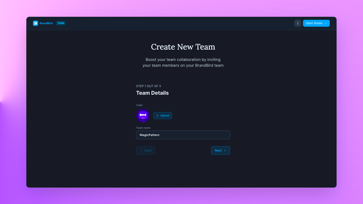 Navigate to brandbird.app/dashboard/team and fill in your team name and upload your logo.