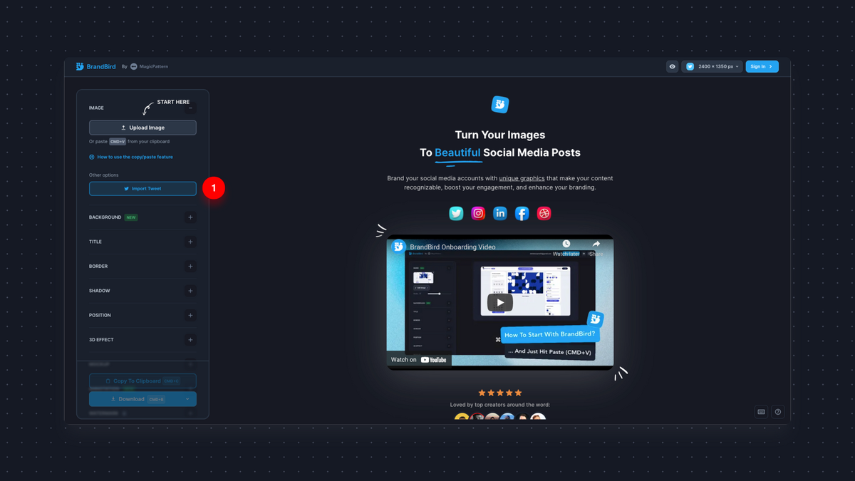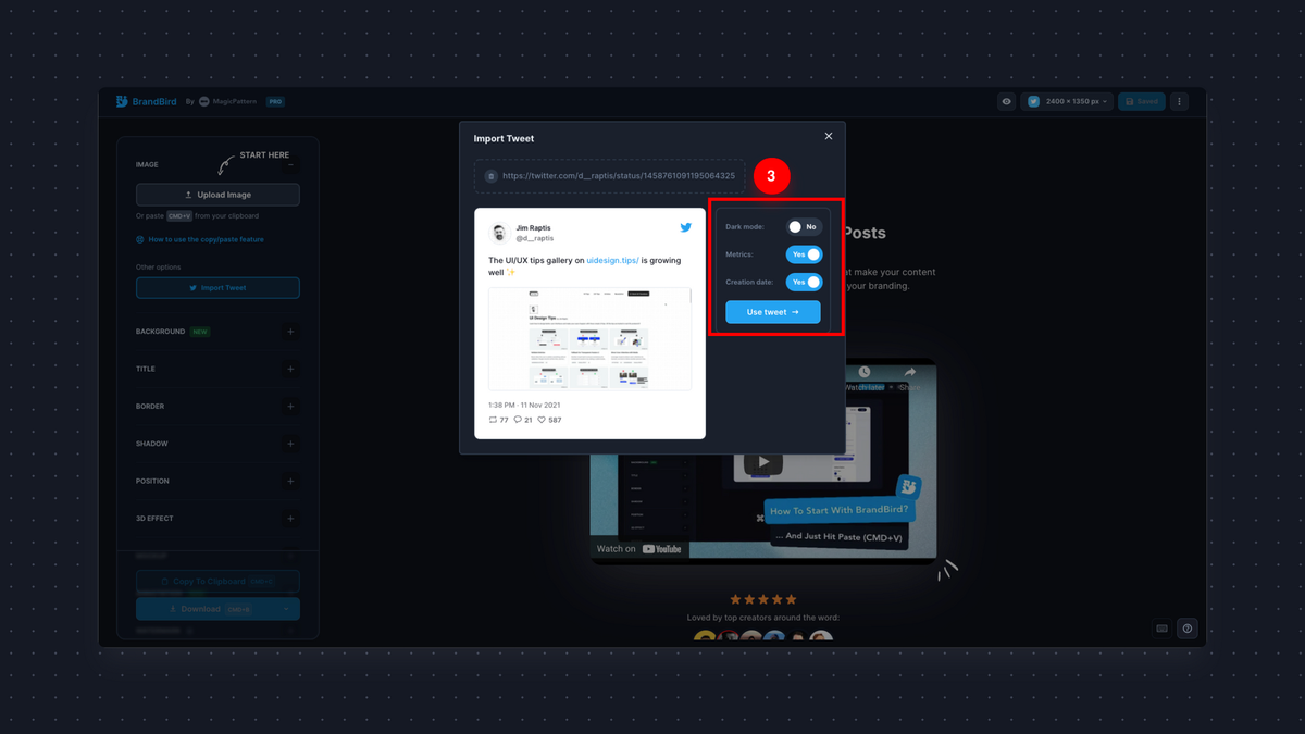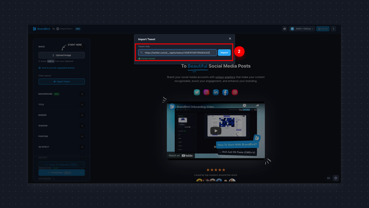 Now, go back to the BrandBird editor and click the "Import Tweet" button on the left sidebar
