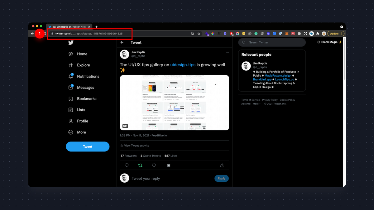 Open your favorite tweet, and copy the URL from your browser URL bar.