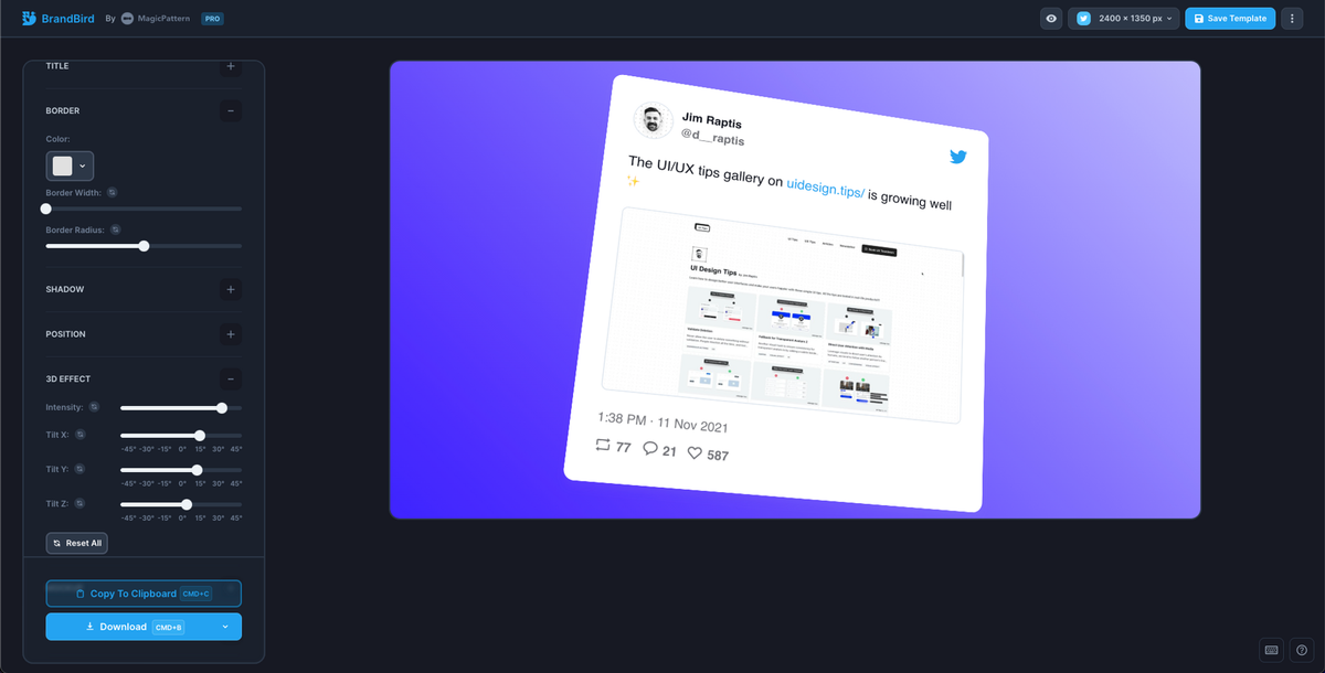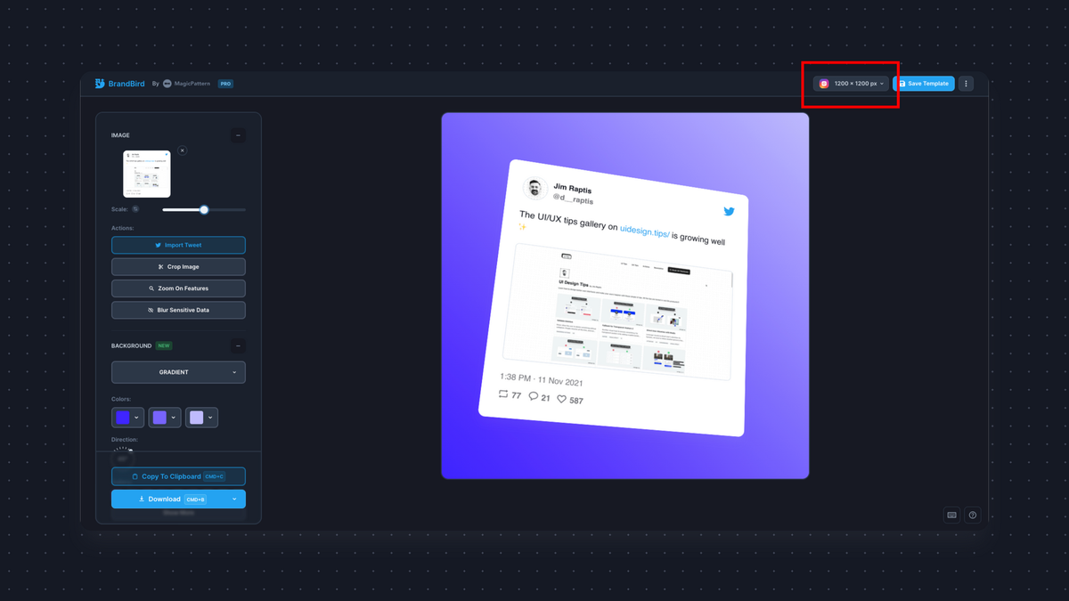 You can tweak further the background and add different styles to your tweet with the basic BrandBird editor. Like cool gradient backgrounds, 3D effects, shadows, and even annotate the image to highlight specific words.